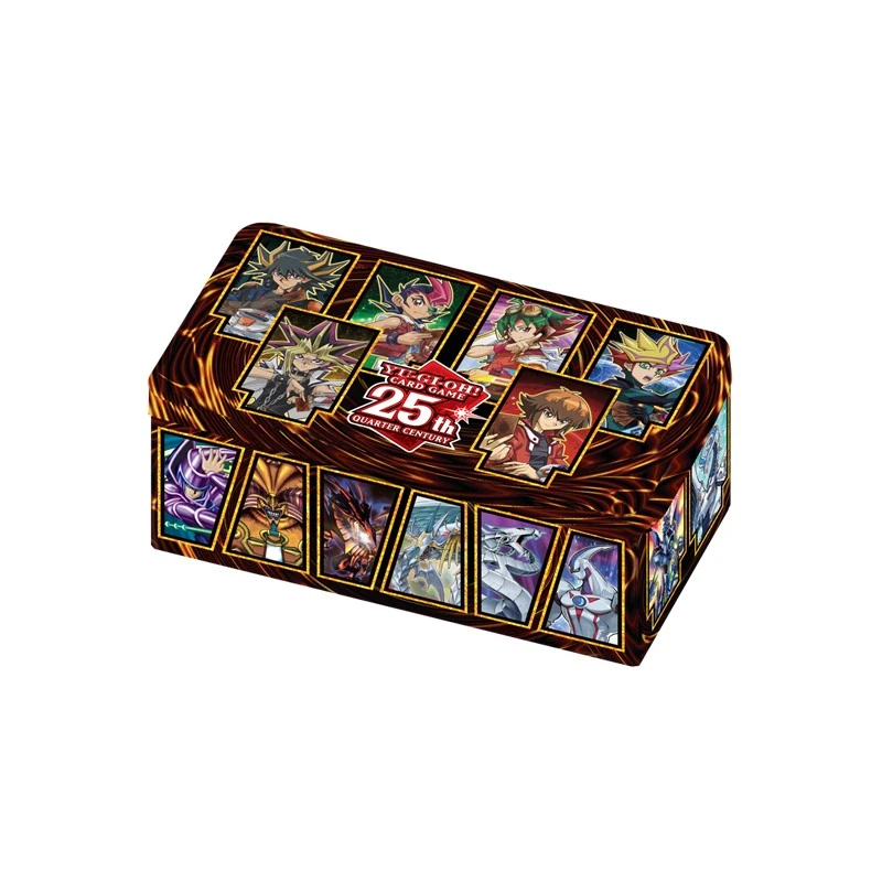 Chaque tin 25ème anniversaire : Dueling Heroes comprend 3 Méga-Packs de 18 cartes, chacun contenant DEUX Secrète Prismatique Rares, deux Ultra Rares, une Super Rare, une Rare, et douze Communes.
