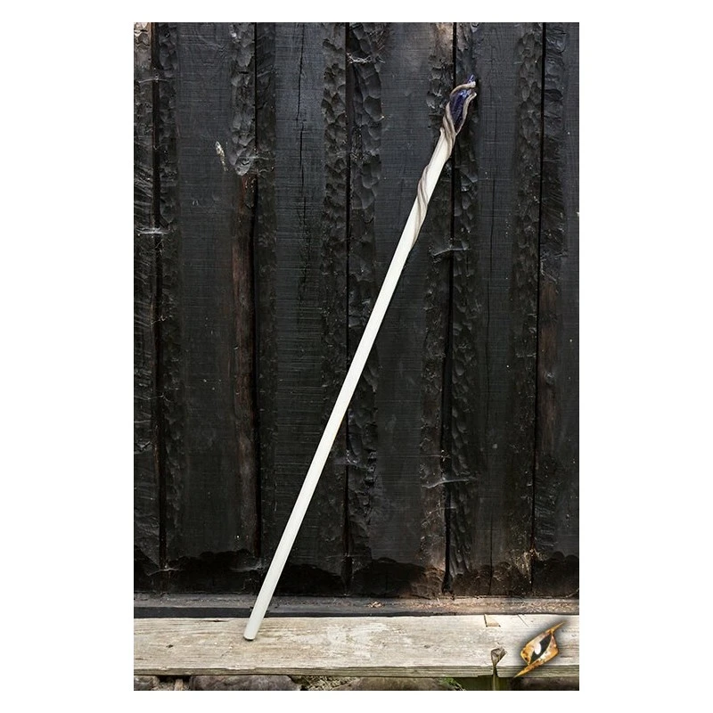 Le bâton de mage d’Epic Armoury est un bâton en latex de 190 cm conçu pour les lanceurs de sorts. Il est léger et naturel, avec une aura magique entourant le cristal bleu peint et sculpté à la main au sommet. Des lianes en bois détaillées attachent le cristal au bâton et s’enroulent en spirale vers le bas dans un style élégant. Le bâton lui-même est d’un blanc crémeux et présente de fines textures en bois.
