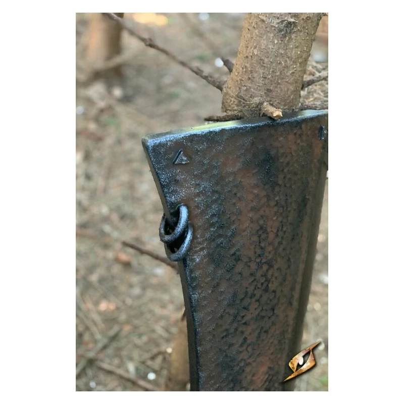 Inspiré des boucliers en forme de croissant utilisés par les Peltastes dans la Grèce antique, le bouclier Raider d’Epic Armoury est un bouclier en forme de demi-lune conçu pour les raiders ruineux et les bellicistes. Sculpté et peint à la main, un côté présente une finition en métal martelé, l’autre une surface lisse et sombre. Pour donner au bouclier un aspect usagé, des effets de rouille ont été ajoutés, et des rivets triangulaires sur les bords donnent l’impression que ce bouclier a été modifié et renforcé à l’aide de matériaux de récupération. Les deux anneaux percés dans le coin supérieur du bouclier sont des détails qui ajoutent à son caractère et permettent de le distinguer de la plupart des autres boucliers. .
