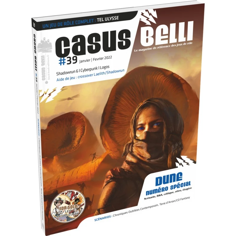 Au sommaire : Shadowrun 6, Cyberpunk, Logos, Aide de jeu : crossover Laelith/Shadowrun, Numéro spécial Dune (scénario, bâtisses et artifices, critique, rétro, étagère), Scénarios : Chroniques Oubliées Contemporain, Terre d’Arran, Chroniques Oubliées Fantasy, une aventure en solo dans le Paris des merveilles de Pierre Pevel, etc…