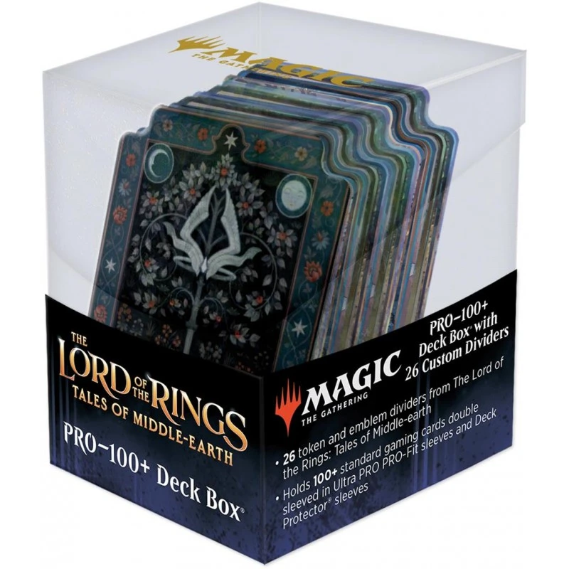 Boite de rangement pour carte, peu contenir 100 cartes sleevees + 26 séparateurs de cartes reprenant les visuels des cartes token de l’édition.
