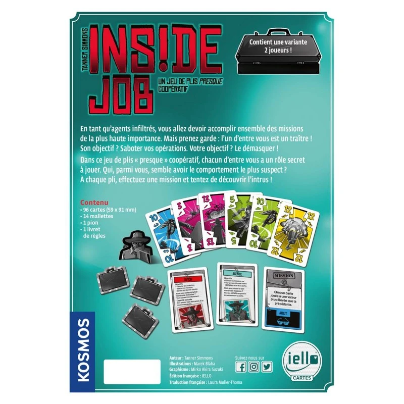 Inside Job est un jeu de plis à très haute tension, dans lequel les joueurs doivent réussir le pli demandé par la carte mission. Chaque carte mission, en effet, indique la manière dont elle doit être résolue et quel est l’atout de la manche en cours.