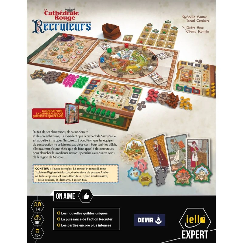 Nous enverrons nos entrepreneurs dans toute la Russie pour recruter le talent des meilleurs spécialistes et artisans du pays pour aider à la construction de la cathédrale. Comme dans le jeu original, chacune de ces guildes contient 3 cartes différentes, dont une par guilde peut être incluse dans le jeu, ce qui signifie que Recruteurs propose 30 nouvelles façons différentes de jouer à La Cathédral Rouge. Un nouveau dé noir fait son apparition et peut être utilisé avec les 5 autres dés existants pour obtenir ressources, diamants et recruteurs.