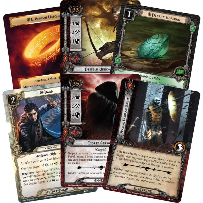 La boîte contient au total 329 Cartes, dont : 7 cartes Héros 57 cartes Joueur 22 cartes Quête 209 cartes Rencontre 6 cartes Campagne 28 cartes Avantage/Fardeau