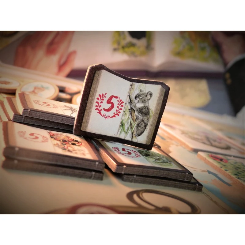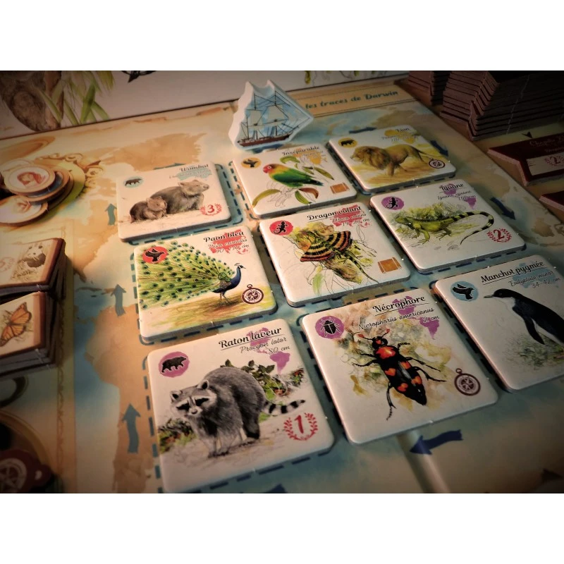 Sur les Traces de Darwin est un jeu familial de collection où les joueurs complètent leur carnet de naturaliste en sélectionnant des tuiles Animal et Personnage depuis le plateau commun de Voyage. Mais attention, seules les tuiles situées en face du navire du Beagle peuvent être choisies !
